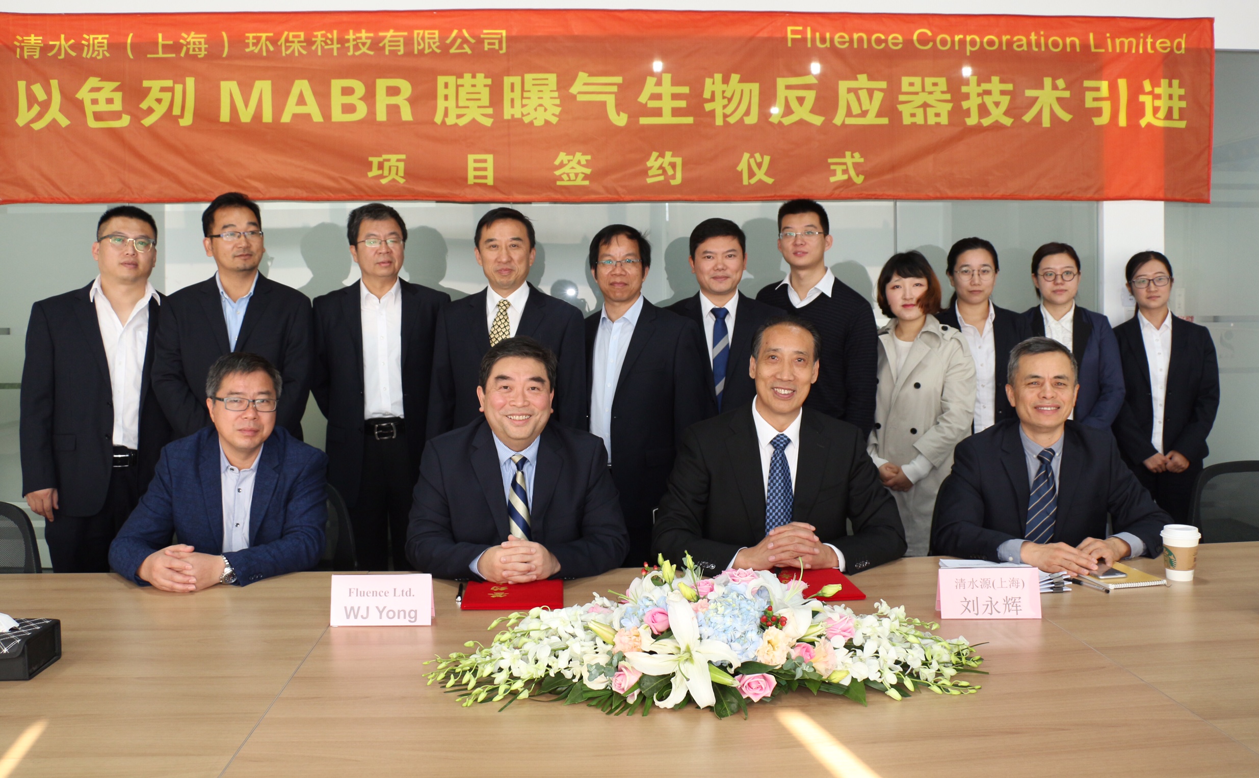 En la foto de izquierda a derecha (primero fila): Sr. Lin Tao, Director de Ventas, sur de China, Fluence China; Sr. Wong Jin Yong, Gerente General, Fluence China; Sr. Yonghui Liu, Gerente General, Qingshuiyuan (Shanghai) Environmental Technology Co., LTD, Sr. Xiao Xie, Vice Gerente General, Qingshuiyuan (Shanghai) Environmental Technology Co., LTD
