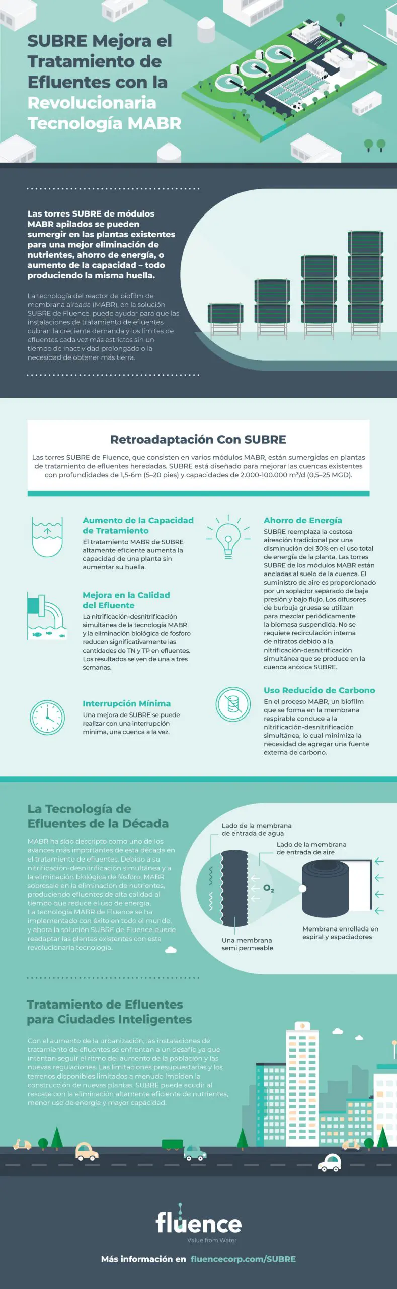 Con el aumento de la urbanización, las instalaciones de tratamiento de efluentes se enfrentan a un nuevo desafío, ya que tratan de estar a la altura del aumento de la población y las nuevas regulaciones. Las limitaciones presupuestarias y los terrenos disponibles limitados a menudo impiden la construcción de nuevas instalaciones. La solución SUBRE MABR de Fluence puede acudir al rescate con la eliminación altamente eficiente de nutrientes biológicos, uso reducido de energía o aumento en la capacidad y progreso hacia el tratamiento de energía neutral dentro de los límites de la planta existente.