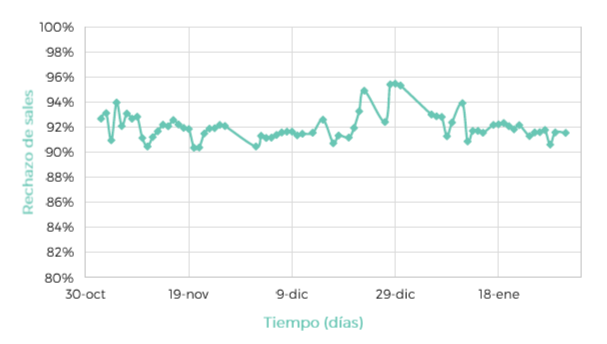 A condutividade do permeado está diretamente relacionada ao desempenho da OR, uma vez que seu objetivo é a remoção de sólidos dissolvidos. Dessa forma, com base na condutividade da alimentação e do permeado, pode-se calcular a rejeição de sais do equipamento. Os resultados obtidos para os dois meses e meio de acompanhamento são apresentados a seguir.