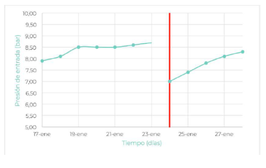 Devido ao alto potencial de incrustação do efluente para reuso, a queda de pressão no sistema aumenta com o tempo e, para manter o fluxo de operação, aumenta-se a pressão de entrada, mas a vazão diminui. Para a fábrica têxtil localizada no Peru, as limpezas químicas (CIP) são realizadas a cada duas semanas.