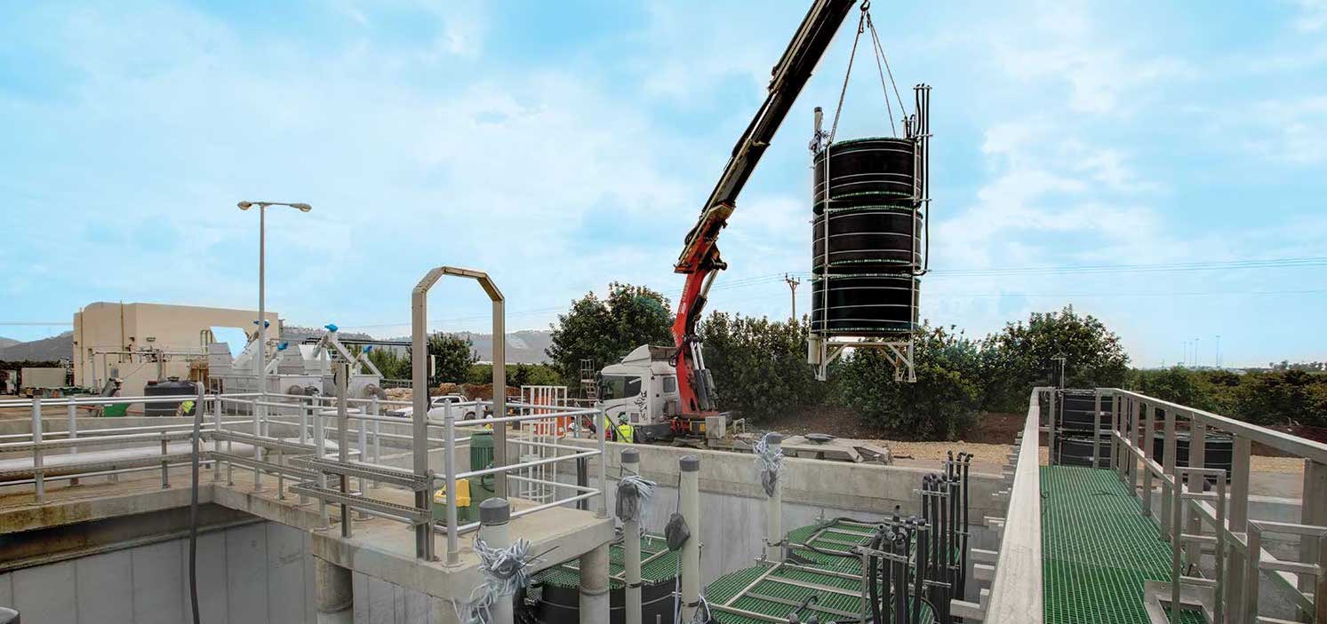 When a conventional activated sludge wastewater treatment facility has reached its limit, Fluence's SUBRE can come to the rescue. Instead of enlarging current plants and building new basins, SUBRE towers are submerged in existing chambers, improving effluent quality, lowering the use of chemicals, saving energy and operational costs, and increasing capacity. SUBRE upgrades wastewater plants using membrane aerated biofilm reactor (MABR) modules. SUBRE is designed to upgrade existing basins with capacities of 2,000-100,000 m³/d (0.5-22 MGD) or improve effluent qualities to meet stringent nutrient regulations.
